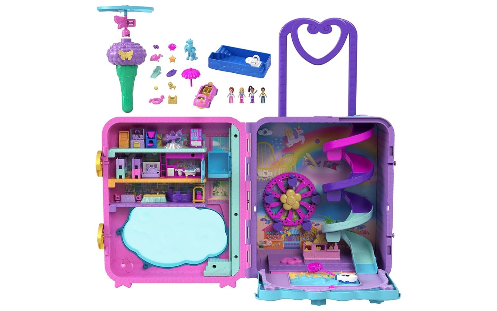 Hit the road or the waves with a variety of themed vehicles, including campers, glitzy cars, and color-changing amusement rides. These accessories expand the Polly universe, allowing dolls to travel between playsets in style.